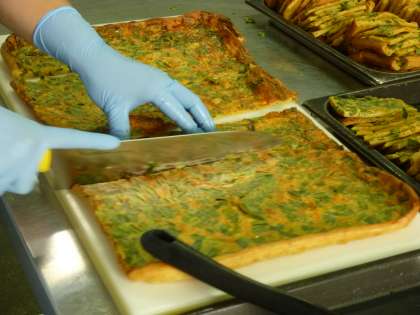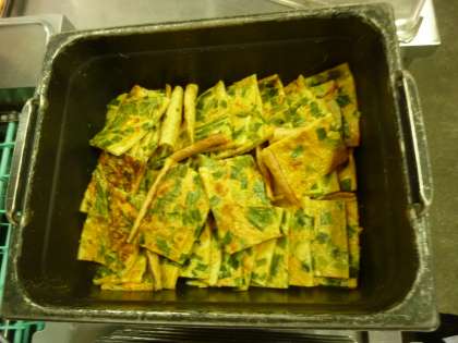 たまご、小麦粉、でんぷん、ごま油、塩、薄口しょうゆ、粉末かつおぶし、コチジャン、にら、にんじん、水を混ぜて鉄板に流しいれ焼いています。焼きあがったら1人分ずつ切ります。