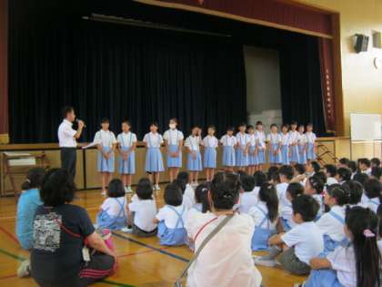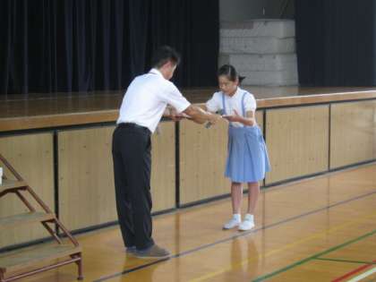 また、1学期がんばったミニバスケットボール女子チーム「大領ファイヤーズ」の表彰と「社会を明るくする運動」の標語が入賞した6年生女子の表彰が行われました。