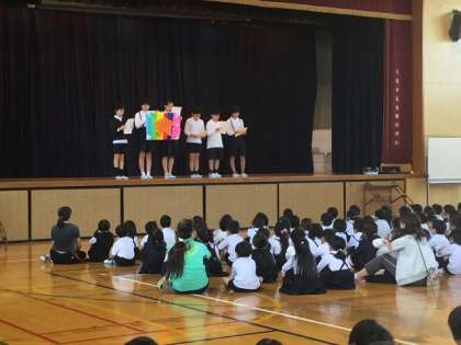 これまで学習してきた平和であることの大切さをかみしめ、また、修学旅行で行う原爆についての学習に対する意気込みなど様々な思いを込めて、6年生全員で「行ってきます!」を1年生〜5年生みんなに言いました。