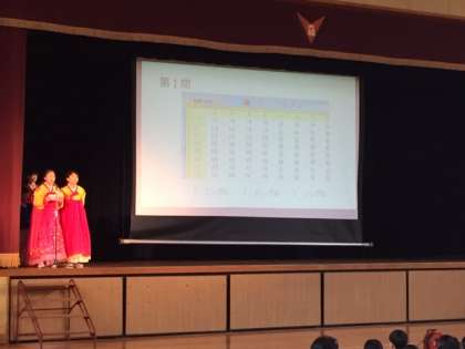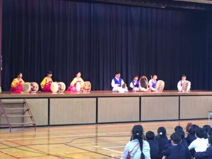 12月3日(月)の朝、校内民族発表会を行いました。南大阪子ども民族音楽会に出場した子どもたちは、韓国・朝鮮の舞踊で、カルチュム(剣の舞)です。手首で上手に小さな剣を回して踊リます。技術もさることながら、踊りながらフォーメーションを変化させるなど、短い練習期間でよく覚えたと感心しました。続いて、総勢7名でサムルノリの演奏を行いました。また、韓国・朝鮮の文化や言葉などもクイズ形式で紹介しました。全校の子どもたちが、韓国・朝鮮について理解を深めることができました。