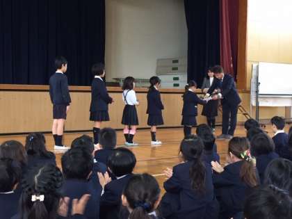 12月25日(火)に終業式を行いました。はじめに、読書感想文で優秀な作文を書いた5人の皆さんと、大阪府の大会で優秀な成績を収めたミニバスの皆さんへ表彰状を伝達しました。そして校長先生から全校児童に、「がんばること・努力することの大切さ」についてお話をしました。また、2学期にさまざまな行事や色々な活動の場で1年生から6年生ががんばっている姿が多く見られたことについて子どもたちを褒めました。最後に生活指導の先生からの「冬休み、健康に安全に過ごそう。」と言うお話でしめくくりました。