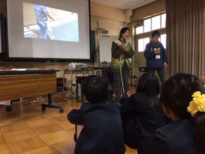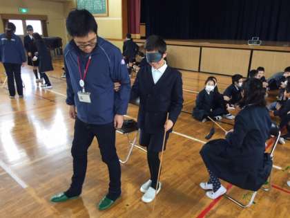 1月29日(火)、5年生は目の不自由な方に手をひいて案内する「手引き体験」の学習をしました。映像で案内の仕方を学習すると、白杖を持った人と手引きする人に分かれて、実際に歩行する体験をしました。また、点字のオセロがあるなど、様々な物があることも学びました。