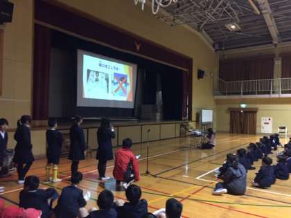 三つの委員会の子どもたちが、それぞれ健康を守るために気をつけてほしいことについて、わかりやすく伝えてくれました。寸劇を披露したり、クイズで楽しく考えたりと興味を引く内容で、みんなで楽しく学習することができました。