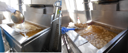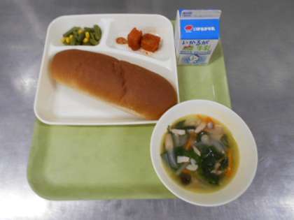 今日の献立は、まぐろのオーロラ煮 スープ さんどまめとコーンのサラダ 黒糖パン 牛乳です。まぐろのオーロラ煮は、角切りのまぐろにでんぷんをまぶし油で揚げたものにしょうが汁、ケチャップ、砂糖、赤みそで作ったたれをからめています。児童に大人気のメニューです。