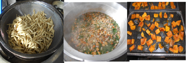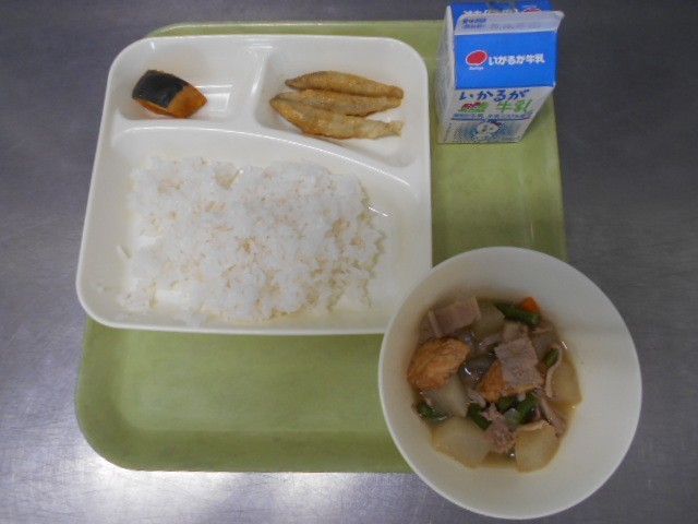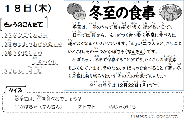 今日の献立は、きびなごてんぷら 豚肉とあつあげの煮もの 焼きかぼちゃの甘みつかけ ご飯 牛乳です。冬至の日を意識してかぼちゃが出ています。冬至にかぼちゃを食べるのは、栄養価が高く保存がきくため寒い冬を乗り切る知恵であり、「ん」がつく縁起の良い食べ物として運気上昇を願う意味があります。今年の冬至は12月22日です。
