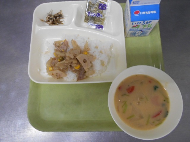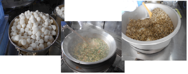 今日の献立は、正月の行事献立です。れんこんのちらしずし ぞう煮 ごまめ 牛乳です。ぞう煮は、かつおぶしでだしをとり、鶏肉、さといも、だいこん、金時にんじん、白玉もちが入っています。白みそが多めのみそ汁です。