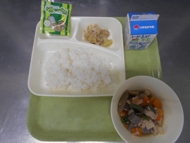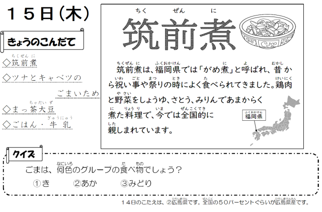今日の献立は、筑前煮 ツナとキャベツのごまいため まっ茶大豆 ご飯 牛乳です。筑前煮は、福岡県の郷土料理です。にんじん、れんこん、ごぼうなどよく嚙んで食べる材料が使われています。