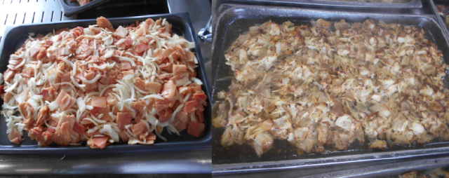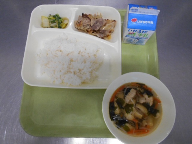 今日の献立は、豚肉のスタミナ焼き 五目汁 きくなとはくさいのおひたし ご飯 牛乳です。豚肉のスタミナ焼きは、豚肉と細切りのたまねぎにみじん切りのにんにく、砂糖、こいくちしょうゆ 白みそで味付けし、焼き物機で焼きます。児童にとても好評なメニューでした。