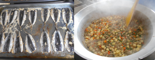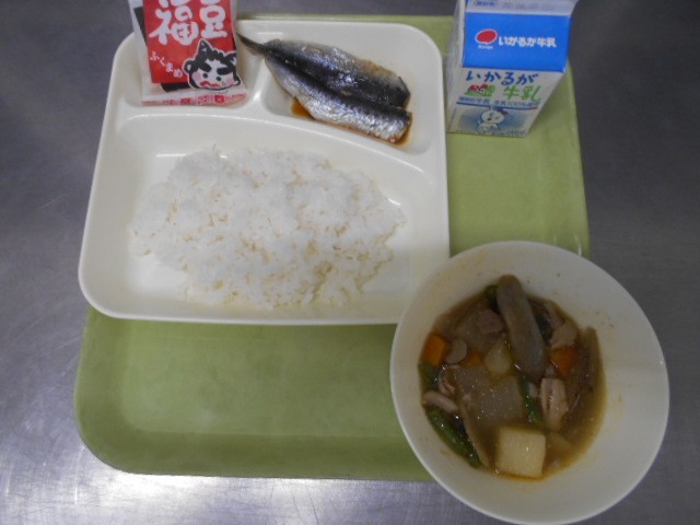 今日の献立は、節分の行事献立です。いわしのしょうがじょうゆかけ 含め煮 いり大豆 ご飯 牛乳です。いわしのしょうがじょうゆかけは、開きのいわしを焼き、しょうがじょうゆのたれをかけています。