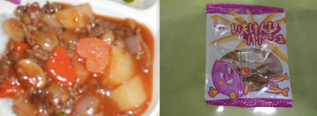 今日の献立は、ハヤシライス きゅうりのバジル風味サラダ いもけんぴフィッシュ 牛乳です。今日のハヤシライスは、上新粉でとろみをつけています。小麦粉を使用していないので小麦アレルギーのある児童も食べられるものです。ハートのラッキーにんじんが入っていました。