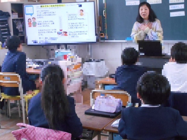 3人の講師の方が来られ3・4・5年生の学級にストレスマネジメントについて簡単な寸劇もまじえながら学習しました。子どもが遊びたい誘惑にどう考えるかなど、いろいろな場面をみんなで考えました。