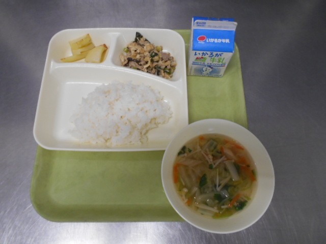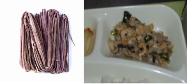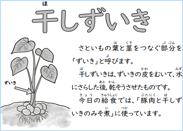 今日の献立は、豚肉と干しずいきの煮もの 五目汁 焼きじゃが ご飯 牛乳です。干しずいきはさといもの葉柄(ようへい)の皮をむき乾燥させたものです。ひものようなものをもどして切って煮物にしています。お腹の掃除をする食物繊維が多く、骨粗鬆症予防のマンガンやむくみをとるカリウムが含まれています。