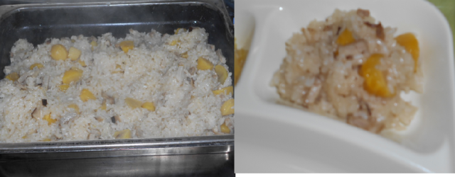 中華おこわは、ミニバットに水につけたもち米、焼き豚、くり、しいたけを加えて水と調味料を加えて焼き物機で蒸し焼きします。