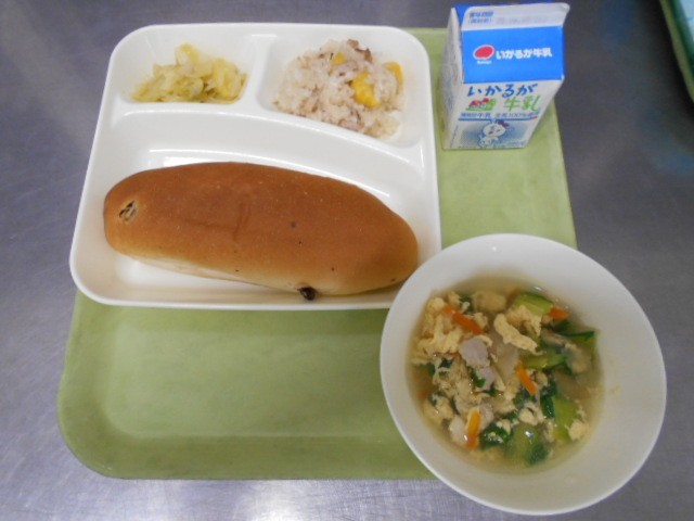 今日の献立は、中華おこわ 卵スープ キャベツのオイスターソースいため レーズンパン 牛乳です。