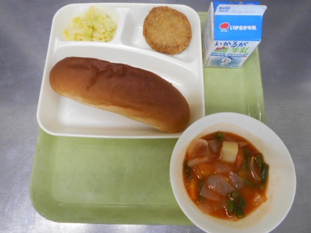 今日の献立は、チキンレバーカツ ケチャップ煮 キャベツのサラダ 黒糖パン 牛乳です。