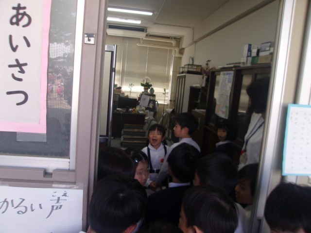 職員室の前でも、説明が始まりました。説明文を読んであげて、カードにスタンプを押していきます。