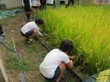 10月21日、5年生が育てていた稲が立派に実り、子どもたちの手によって収穫を行い...
