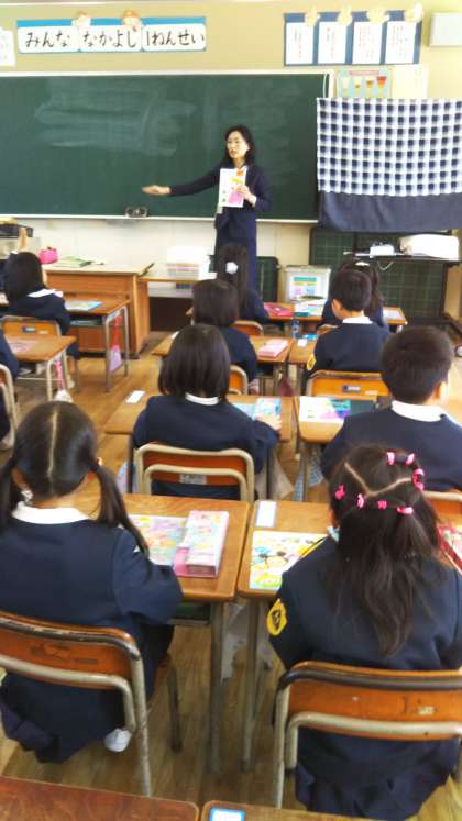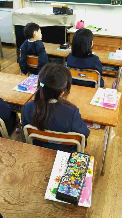 教科書、ノート、筆箱、下敷は、右上に重ねて置きます。先生の話を聞いて、できましたか?