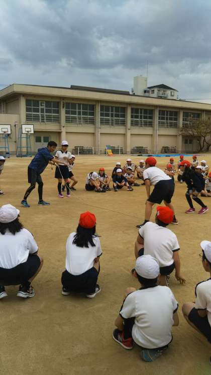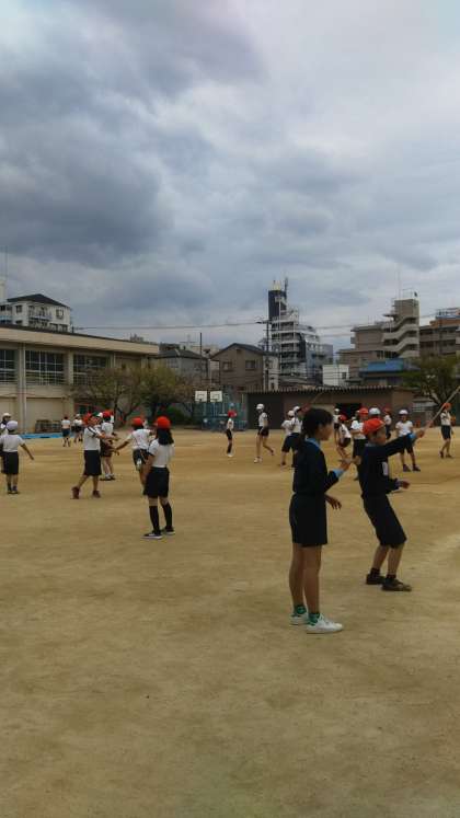 「みんなでハイタッチ」をテーマに音楽をかけて自由に動き回り、出会った人とハイタッチ。縄跳びで向こうとこちらでハイタッチ。楽しく体ほぐしの運動をしました。