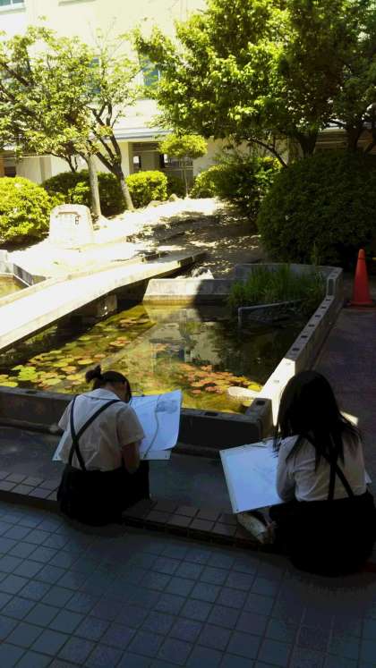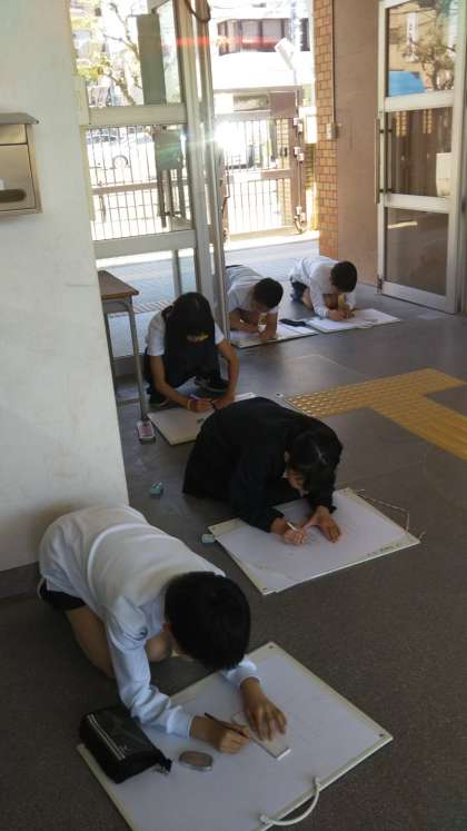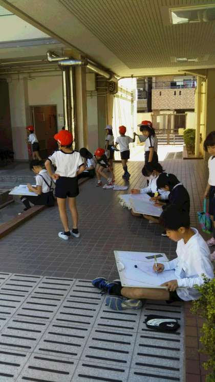 校内で好きな風景を探して写生をしています。低学年の子どもたちも興味津々です。