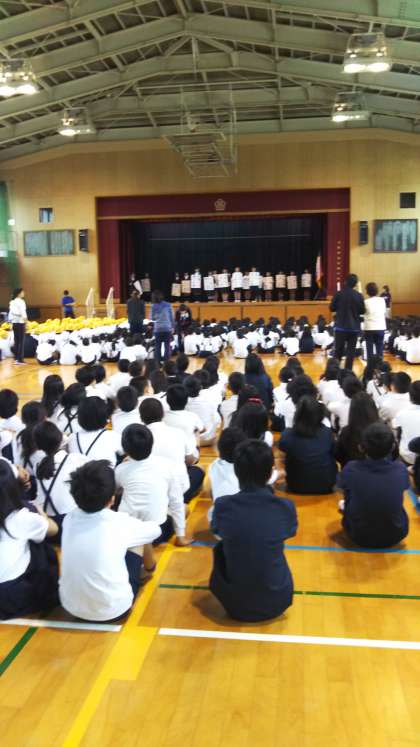 「自己紹介集会」で、新たな代表委員や児童会の仕事の紹介がありました。聞いている子どもたちもとても集中していました。