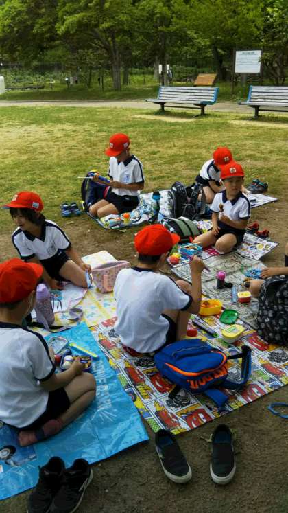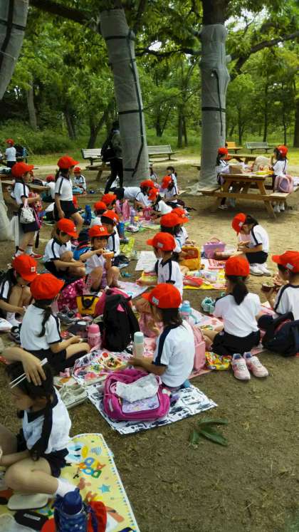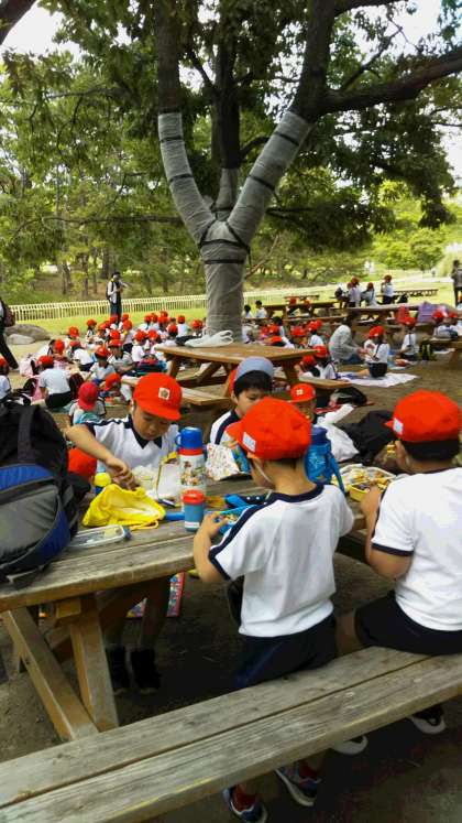木陰でお楽しみのお弁当、おうちの方々の心を尽くしのお弁当、ありがとうございます。