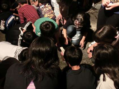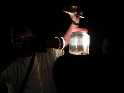 25分後ビンを上げて、目の細かな網に流し込む。そして、触ってみると青白い光を放つ。「わあ・・」という感動の声が聞こえました。