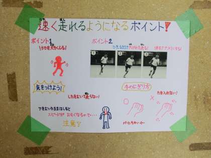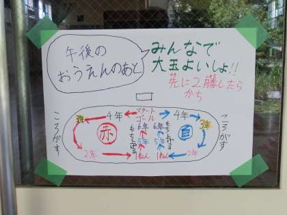 講堂の入り口や支柱に運動会関係のポスターを掲示しています。