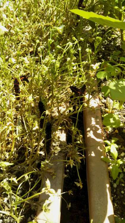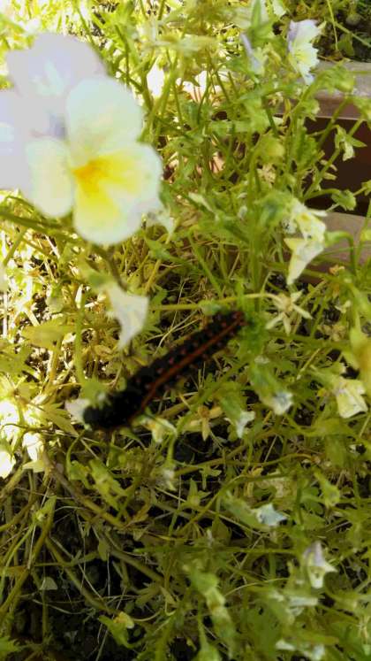 10日ほど前から学校のサニーガーデンのビオラのプランターにツマグロヒョウモンがいます。幼虫は、毒々しい色をしていますが害はないということなので、子どもたちにもそっと観察してねと言っていました。学校図書館で調べて成虫のオレンジ色の蝶の写真を見せてくれる子どもたちもいます。「サナギが光ってる」と教えてくれる子もいます。ところが、だんだんビオラの葉が食い荒らされ鉢の方まで移動してきました。そこで子どもたちにどうしたものかと朝礼で相談をしました。どんな解決方法を考えてくれるか楽しみです。