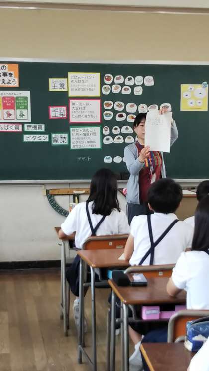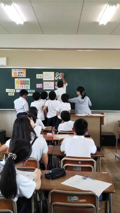 6年生が栄養教室で「バランスのとれた食事をしよう」をテーマに学習しました。まずワークシートを使って、バイキング給食から自分の好きなメニューを考えました。食べ物の栄養の三色の黄色、赤色、緑色のグループのそれぞれの働きを思い出し、5大栄養素についても学びました。そして食事には、主食、主菜、副菜がありバランス良く食べることが大切であり、給食はバランスの良いメニューが考えられていることを知りました。最後にワークシートで初めに考えた給食のメニューをもう一度栄養のバランスが良い メニューに考えた直しました。みんな栄養のバランスを考え主食、主菜、副菜のそろった給食のメニューを発表しました。