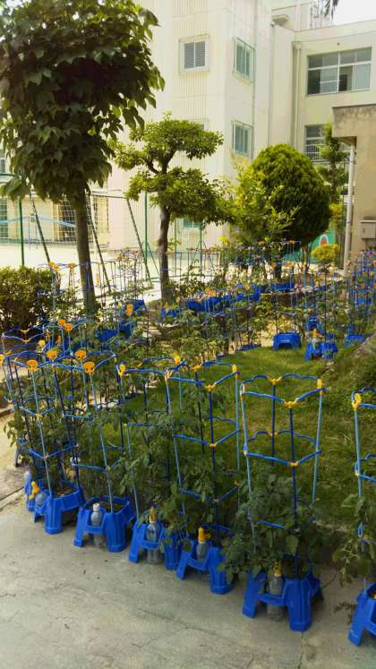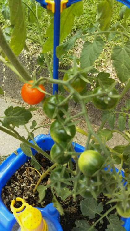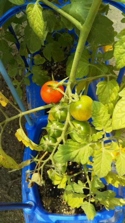 2年生のミニトマトの実が色づき始めました。近畿地方は、なかなか梅雨に入りません。しっかりお水をあげましょう。