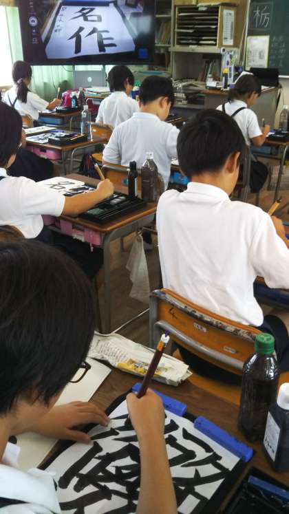 習字で「名作」と書きました。姿勢、筆の持ち方、始筆の斜めの入りかた、縦画、横画、おれ、右払い、止めなどに気をつけて書きました。