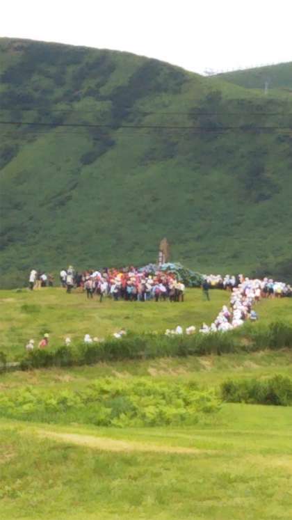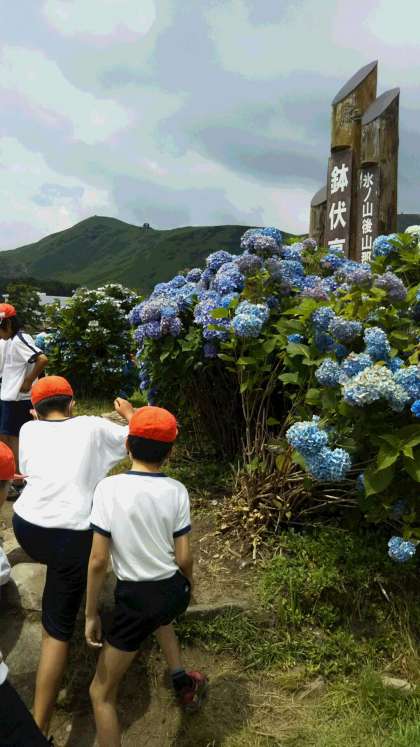 ハチ高原の碑の前で記念写真を撮りました。たくさんの子どもたちが訪れていますので、順番待ちです。