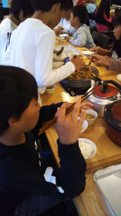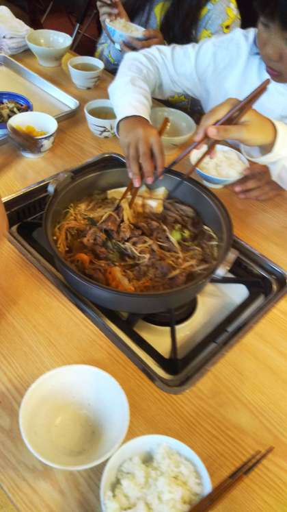 夕食は、すき焼きです。食事当番が中心になってお世話をします。おいしくきれいにいただきました。