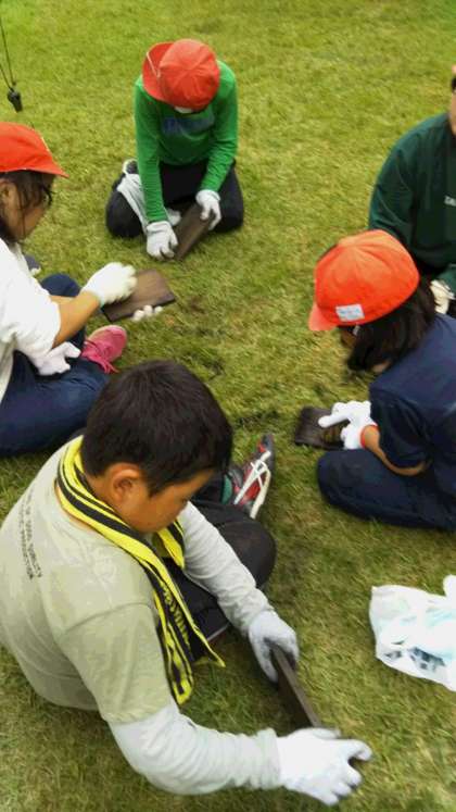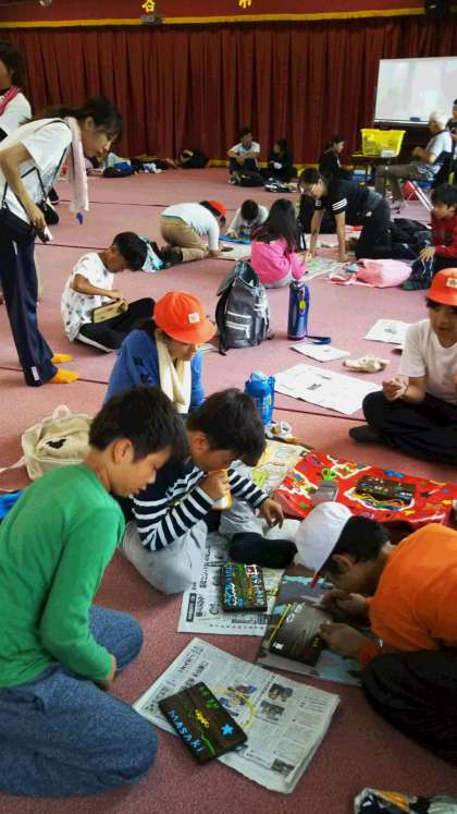 焼き板のすすを落としたころに、にわか雨。宿舎の5階で絵付です。