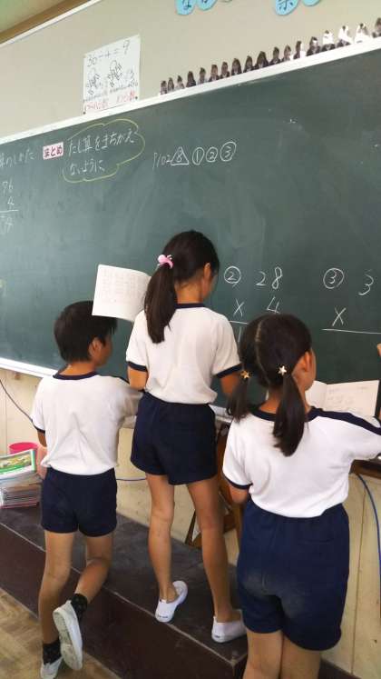 二桁かける一桁の筆算のやり方を考えて、練習をしました。繰り上りに気をつけて計算しました。