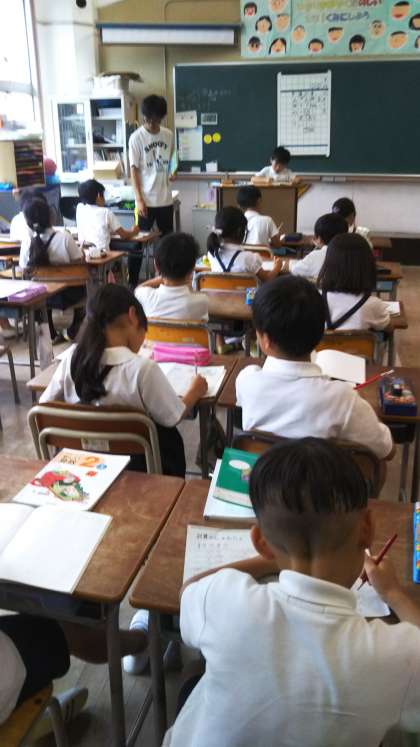 二桁たす二桁の筆算の答え合わせをしています。自分たちで「??たす△△は??です。どうですか?」「合っています。」と調子よく順番に答えていきます。係の子が前で進めることもあります。