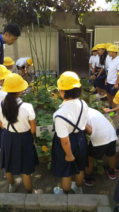 カボチャの花を観察しました。「花の中にアリが入ってる。」「花びらがしぼんでる。」「小さいカボチャがなってる。」