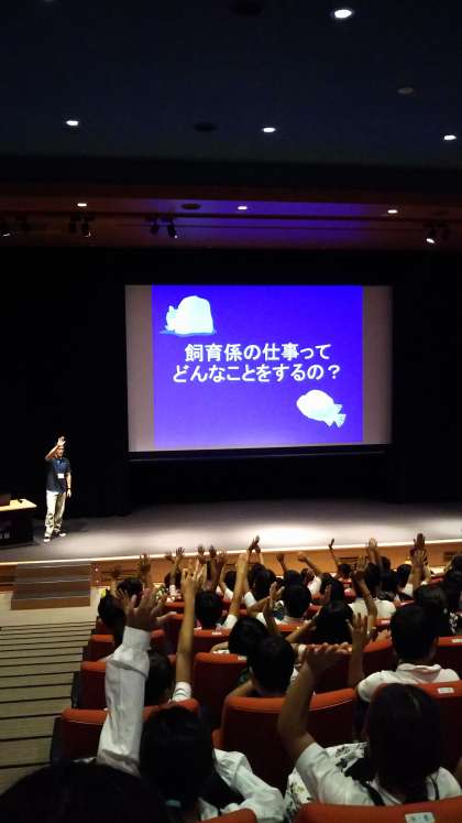 飼育係さんの仕事を教えいただきました。主には、「掃除、調餌、給餌」です。トライスーツを着る体験をしたり、映像をみたりしました。「えー、300キロの餌!」「ペンギンの赤ちゃん、かわいい!」