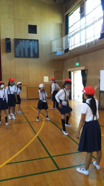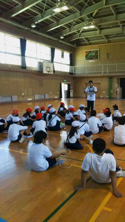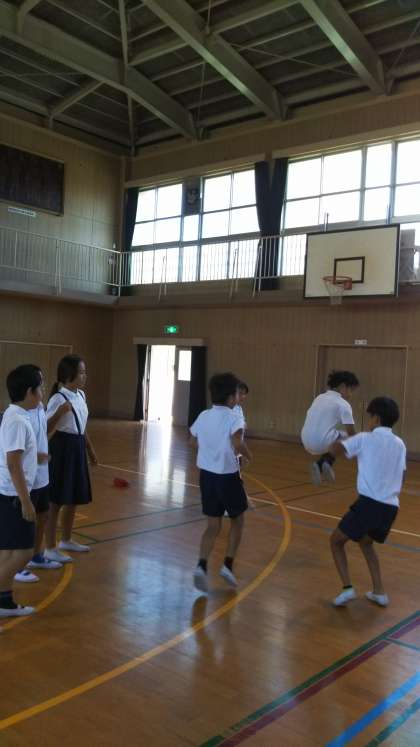 大縄に挑戦しています。2分間で何回跳べるか各班で競ったり、ダブルダッチに挑戦したりしました。