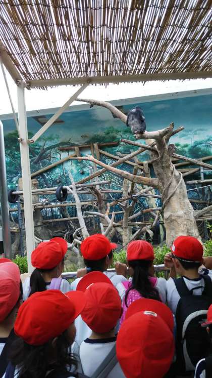白熊は大人気なかなか前で見れません。みんな譲りあって自由に動き回る白熊を嬉しそうに見つめています。最後に珍しいチンパンジーの放尿と排泄を見ました。みんな大騒ぎでした。これから学校に向かいます。みんな元気です。楽しいおみやげ話を持って帰ります。