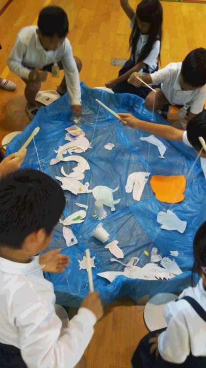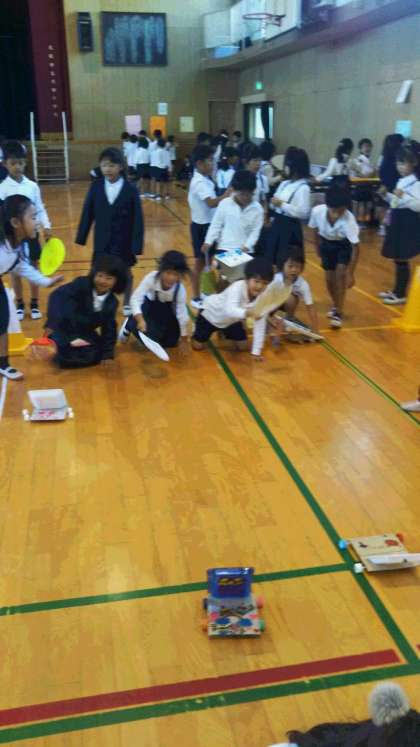 2年生が作ったおもちゃを1年生に遊ばせてあげました。