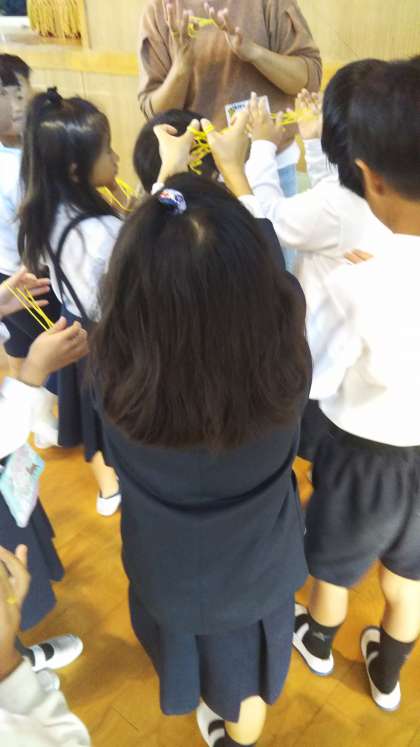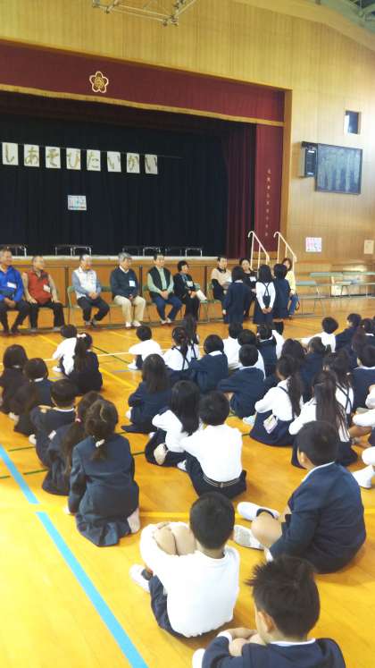 地域の方々にお越しいただき、昔あそびを教えていただきました。こままわし、はごいた、けん玉、お手玉、あや取り、おり紙の6種類です。始めと終わりはしっかりごあいさつ。なかなかうまくいかないこともありましたが、楽しく活動しました。