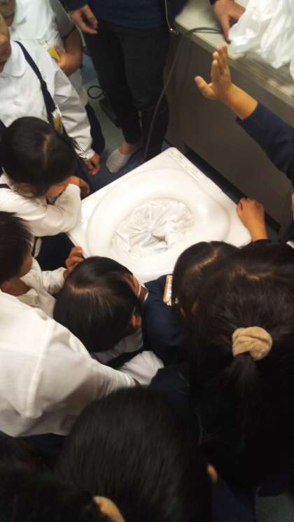 「ラップポントイレ体験」便が完全にラップされ、臭いもありません。