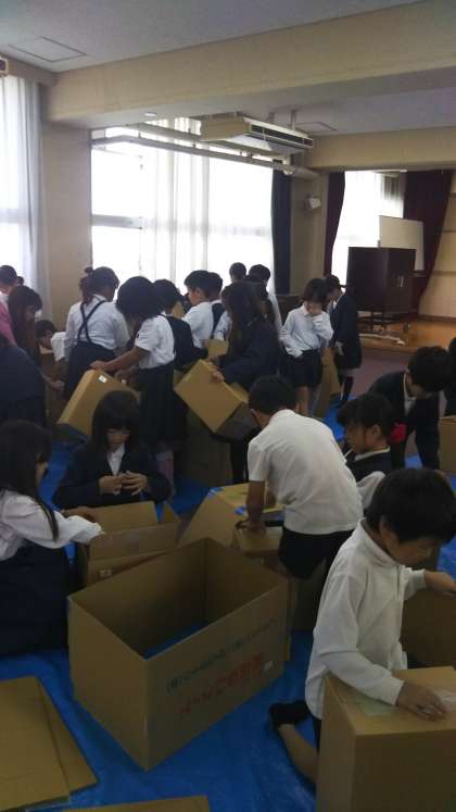 「ダンボールベッド作り」ダンボールの箱を敷き詰めてベッドを作ります。床に寝るより随分寝ごごちがいいです。