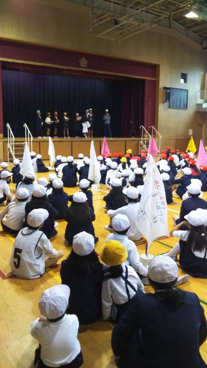 図書委員会による「本から生まれた本太郎」の劇がありました。本太郎が、犬、猿、雉を連れて、苅田小学校のゲーム大王を倒しに行きます。