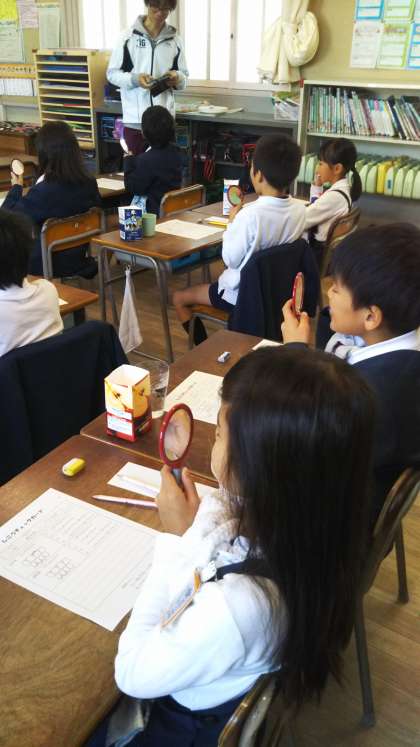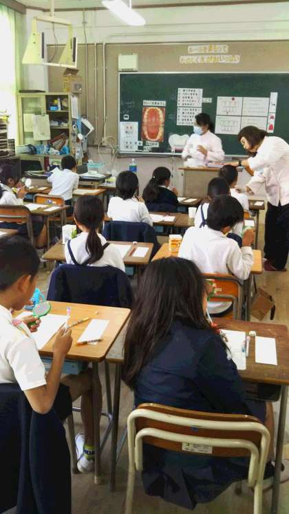 歯科衛生士さんに虫歯の原因の歯こうをきれいにおとす歯ブラシの仕方を教えていただきました。鏡を見ながら、歯こうを染めた赤い薬をちょこちょこ磨きや縦磨きをしておとしていきます。