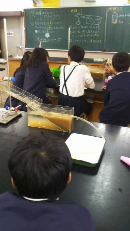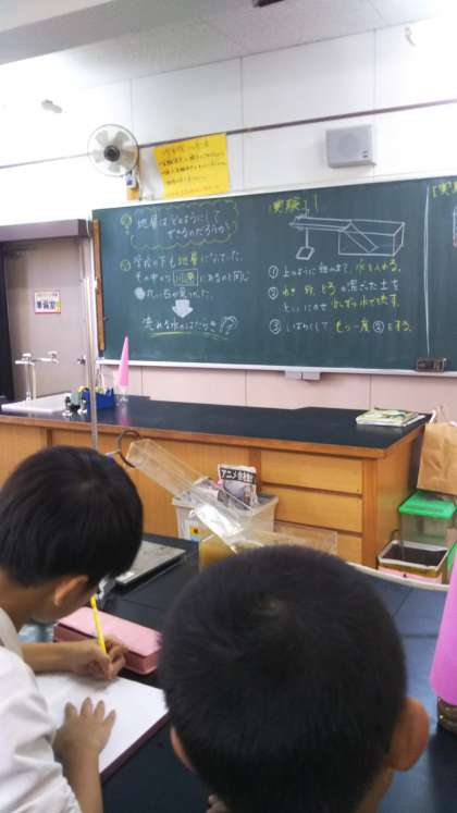 「地層はどのようにしてできるのだろうか」と実験をしました。れき、砂、粘土が流れる水のはたらきで粒の大きい順に堆積していく様子がよくわかりました。