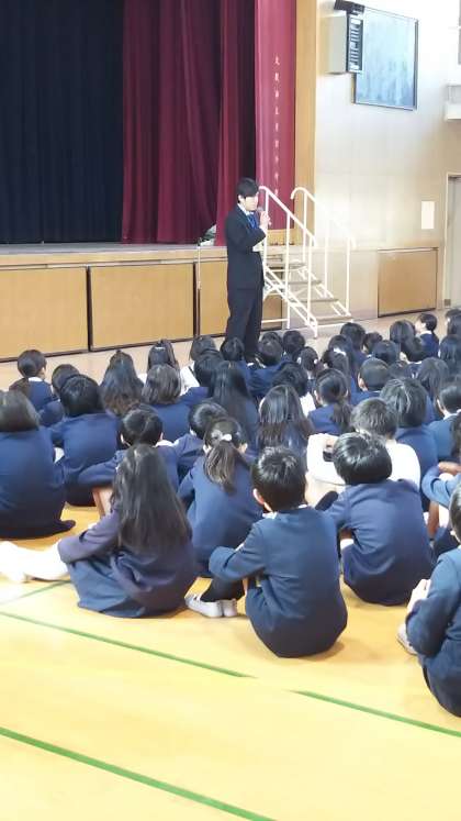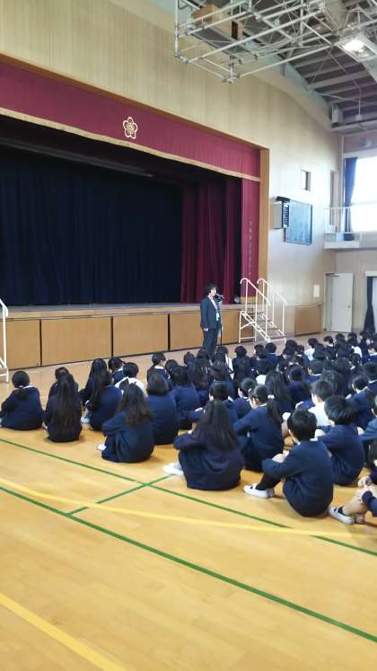 今日、2学期の終業式が行われました。校長先生からは、作品展でみんなが頑張って作った作品について感想を伝えました。そして、先日、実施したいじめアンケートについてお話がありました。1学期のいじめアンケートより件数が減ったことやいじめられた時は一人悩まないで先生やお家の人に話してほしいと伝えられました。また生活指導担当の先生からは冬休みの暮らし方についてのお話がありました。最後に全児童で校歌と大阪市歌を歌いました。3学期には元気に登校しましょうというあいさつの後、みんな教室にもどって行きました。