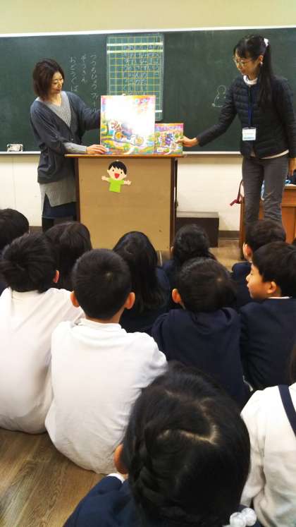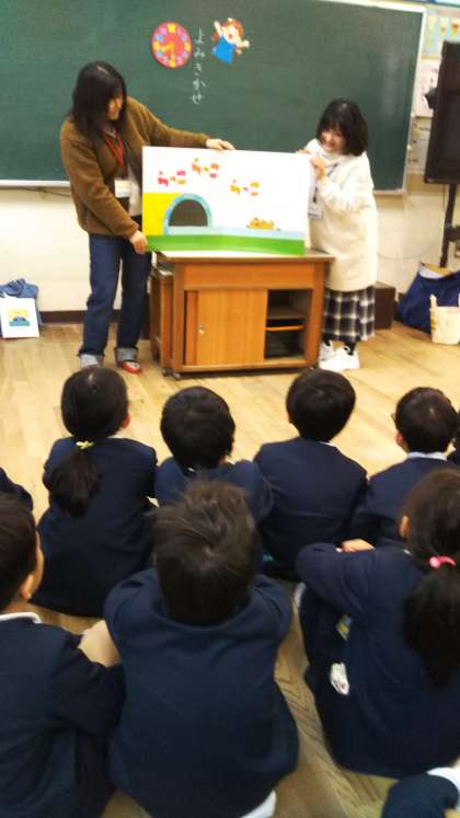 3学期のとしょっぴぃさん方による読み聞かせが始まりました。大きな絵本で子どもたちは大喜び!一緒に声を合わせたり、返事をしたりして盛り上がりました。